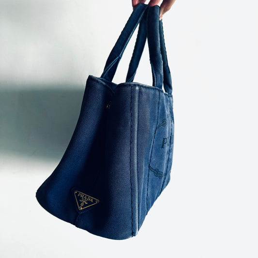 Prada Dark Blue Denim GHW Small Canapa Classic Logo Structured Shopper Tote Bag