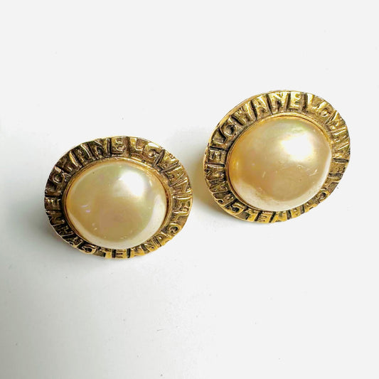 Chanel Giant CC Monogram Logo Large Gold & Pearls Clip On Vintage Earrings