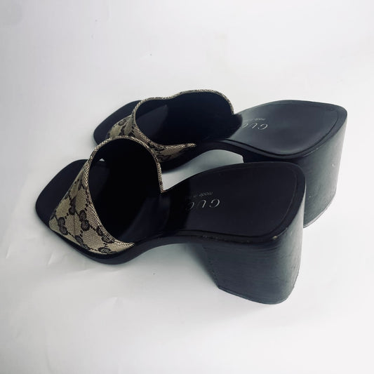 Gucci Beige / Brown Monogram Logo Mules Heels Pumps Platform Sandals Clogs Shoes