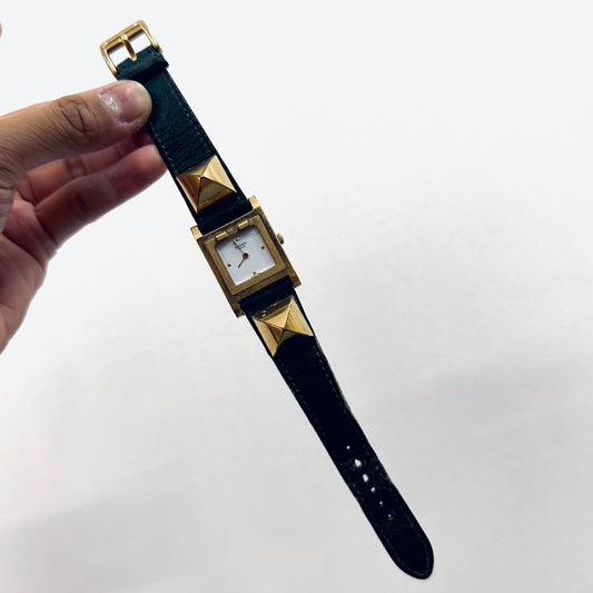 Hermes Medor Studded Emerald Green & Gold GHW Stainless Steel Leather Strap Small 25MM Quartz Vintage Watch