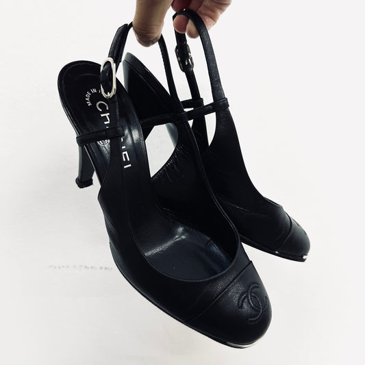 Chanel Classic Giant CC Logo Black Lambskin Leather Closed Toe Heels Slingback Pumps Shoes