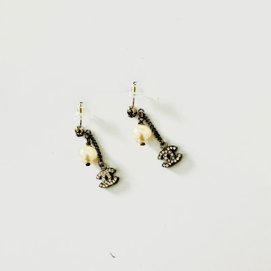 Chanel Classic CC Monogram Logo Pearl & Crystals Silver Dangling Vintage Stud Earrings