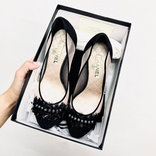 Chanel Classic CC Monogram Logo Mesh Black Lace Closed Toe Ballet Ballerina Heels Pumps Shoes