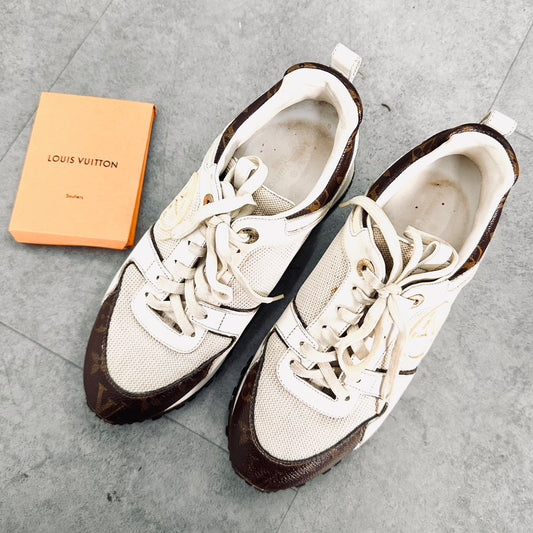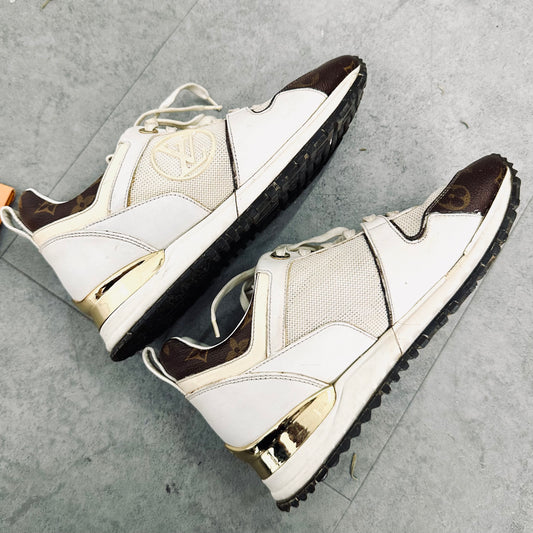 Louis Vuitton LV Run Away Runaway Giant Monogram Logo GHW / White Calfskin Leather & Mesh Lace Up Sneakers Shoes