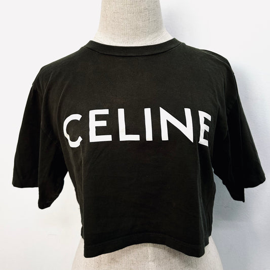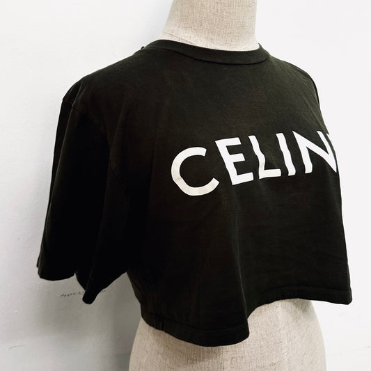 Celine Army Olive Green Giant Monogram Logo Jersey Crop Top T Shirt Tee