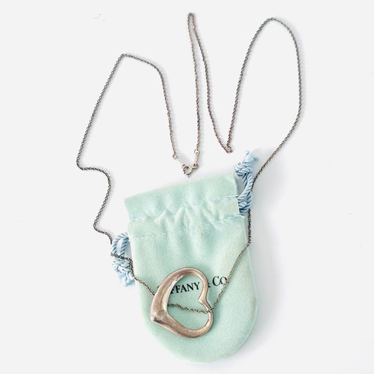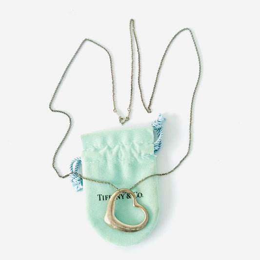 Tiffany & Co T&C Elsa Peretti Open Heart Large Pendant Classic 925 Sterling Silver Long Chain Necklace