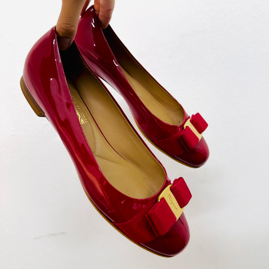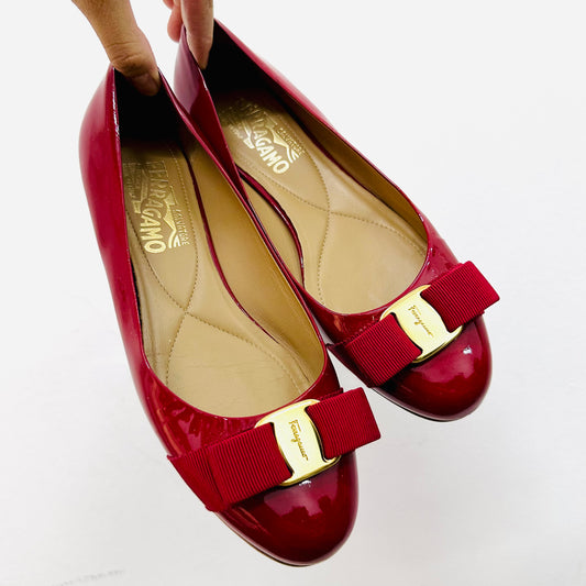 Salvatore Ferragamo Vara Red GHW Giant Monogram Logo Bow Ballet Ballerina Patent Leather Classic Flats Shoes