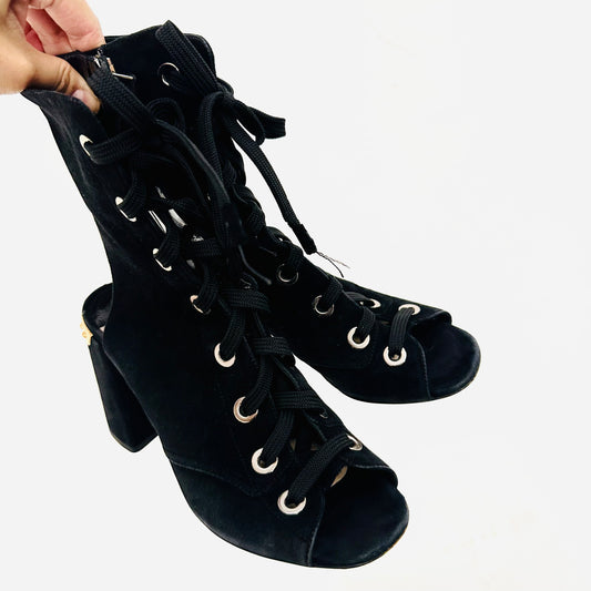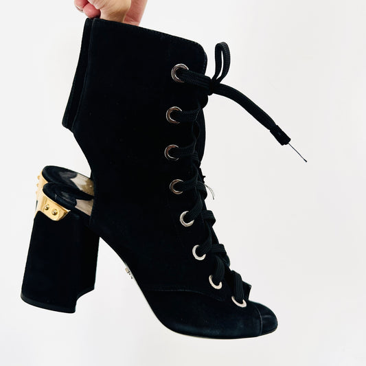 Prada Black GHW Gold Monogram Logo Suede Lace Up Side Zip Open Toe Chunky Heels Pumps Boots Shoes