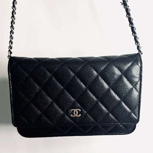 Chanel Black CC Logo Classic WOC Quilted Caviar Leather Wallet On Chain Shoulder Sling Flap Bag 28s