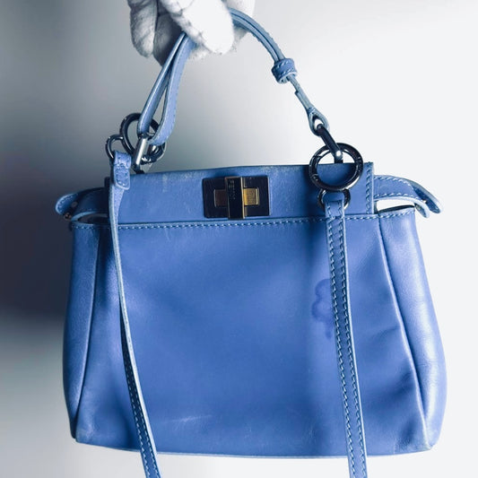 Fendi Peekaboo Mini Blue GHW FF Zucca Monogram Logo Nappa Leather 2-Way Shoulder Sling Turnlock Top Handle Bag