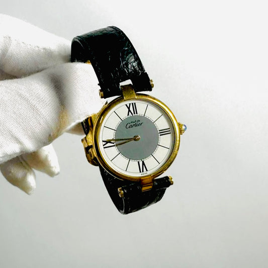 Cartier Must De Vendome Vermeil Gold Round Dial Black Embossed Leather Strap 30MM Quartz Watch