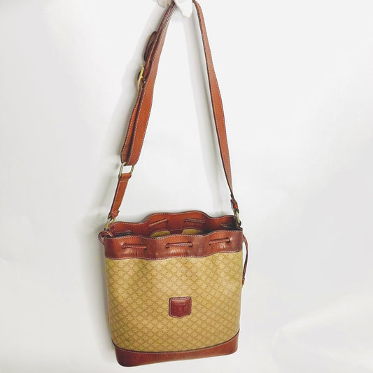 Celine Beige GHW Triomphe Macadam Monogram Logo Vintage Bucket Drawstring Shoulder Sling Bag With Pouch