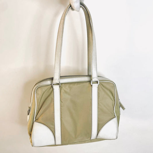 Prada Khaki Beige / White Tessuto Utility Monogram Logo Nylon & Leather Boston Bowling Shopper Shoulder Tote Bag