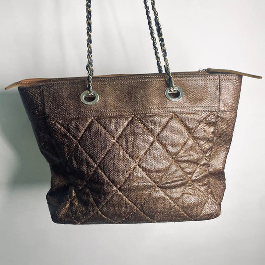 Chanel Dark Brown / Bronze Paris Biarritz CC Monogram Logo Quilted Coated Fabric & Leather Shopper Shoulder Chain Straps Tote Bag 13s