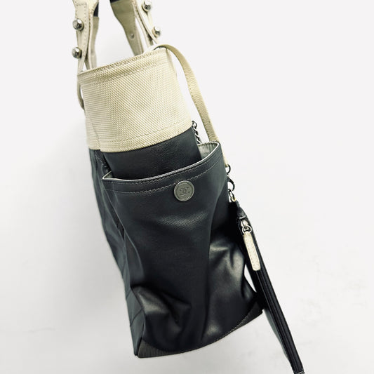 Chanel Grey Gray / White Paris Biarritz CC Monogram Logo Quilted Coated Fabric & Leather Shopper Shoulder Tote Bag With Pockets 11s