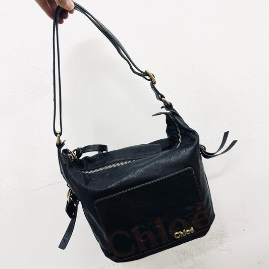 Chloe Eclipse Black GHW Leather Monogram Logo Hobo Baguette Shoulder Sling Bag