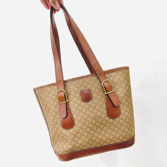 Celine Beige Triomphe Macadam Monogram Logo GHW Bucket Vintage Shoulder Shopper Tote Bag