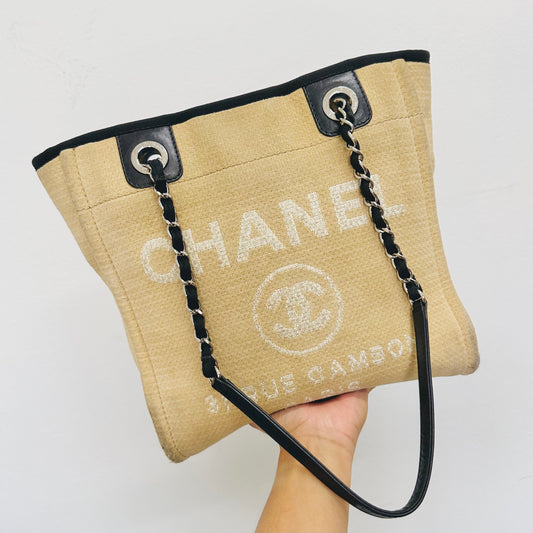 Chanel Beige / Black Deauville PM Small Giant CC Monogram Logo Shoulder Shopper Tote Bag 15s