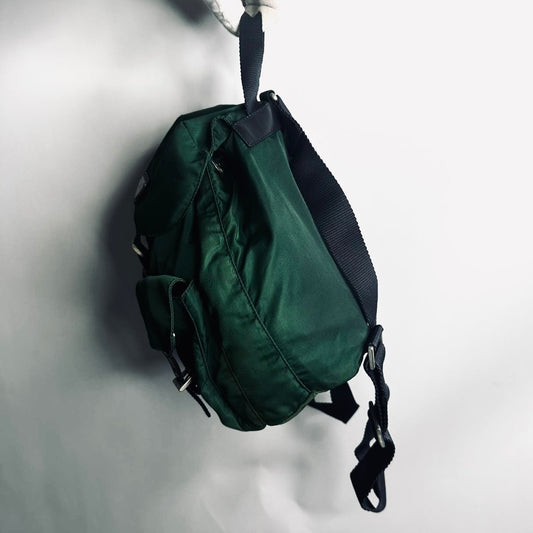 Prada Green Vela Monogram Logo Nylon & Leather Flap Backpack Drawstring Bag