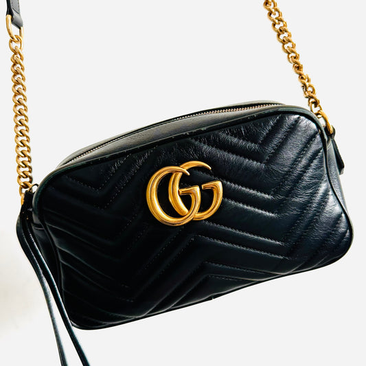 Gucci Marmont GG Monogram Logo Black GHW Leather Small Camera Shoulder Sling Bag