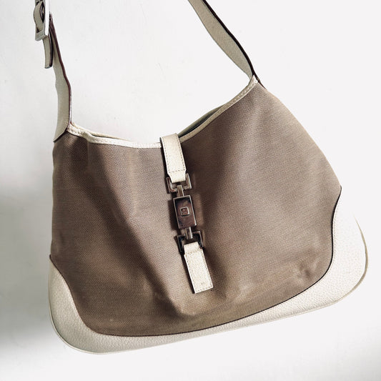 Gucci Jackie Beige Monogram Logo Fabric & Leather Hobo Baguette Shoulder Bag