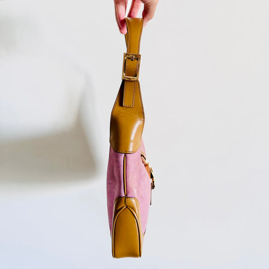 Gucci Pink / Tan Brown GHW Jackie Monogram Logo Suede & Leather Hobo Baguette Shoulder Bag