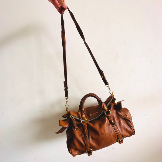 Miu Miu Caramel Brown GHW Bow Vitello Lux Classic Logo Shopper Shoulder Sling Tote Bag