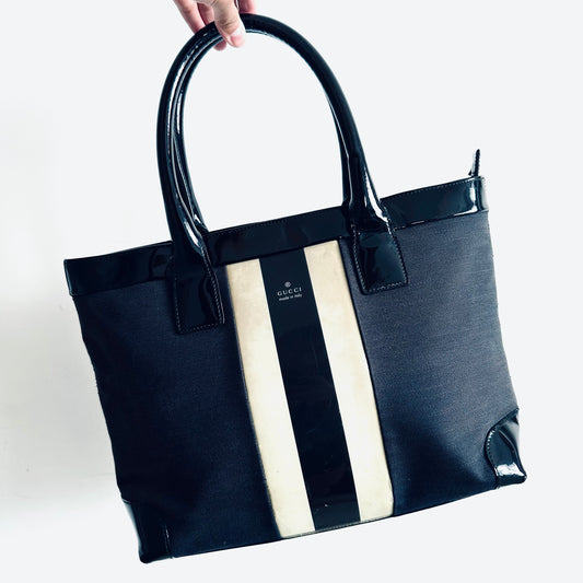 Gucci Navy Blue Web Striped Logo Structured Shopper Zip Tote Bag