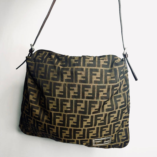 Fendi Brown Zucca Zucchino FF Monogram Logo Mamma Hobo Baguette Shoulder Bag
