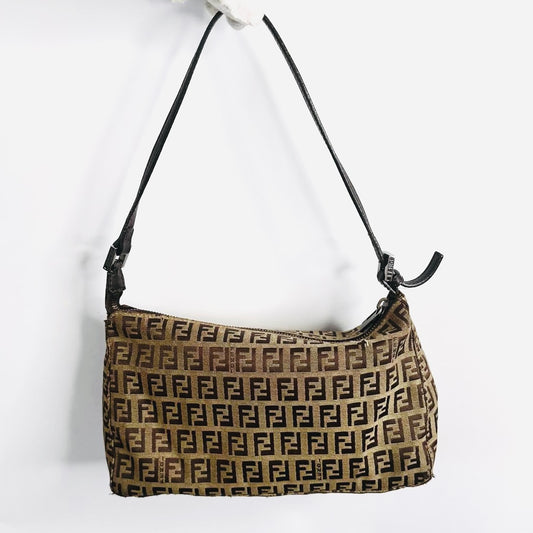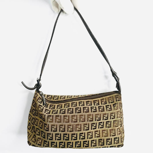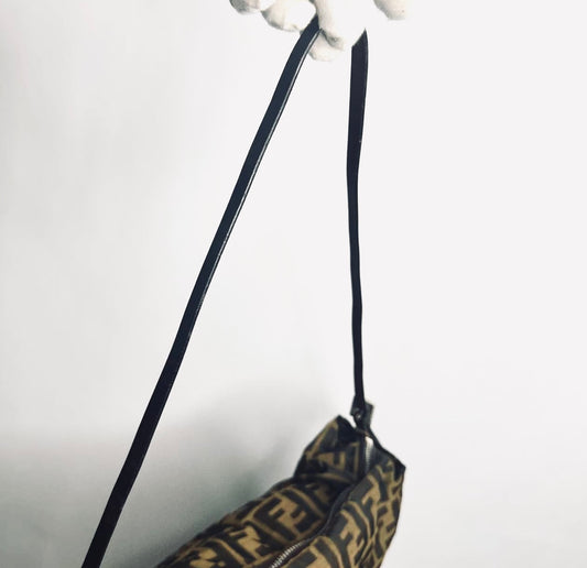 Fendi Brown FF Zucca Zucchino Monogram Logo Pochette Baguette Hobo Shoulder Bag