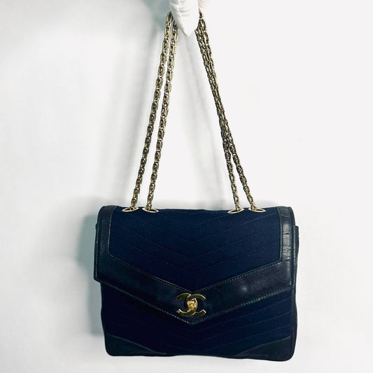 Chanel Navy Blue GHW CC Logo Turnlock Small Classic Single Chevron Quilted Jersey & Lambskin Flap Reissue Chain Vintage Shoulder Sling Bag Pre Series
