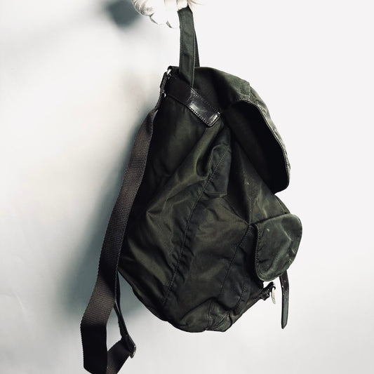 Prada Dark Khaki Classic Tessuto Monogram Logo Nylon & Leather Backpack Flap Drawstring Bag
