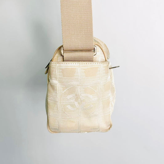 Chanel Taupe Beige Travel Line Quilted Jacquard CC Monogram Logo Shoulder Sling Hobo Baguette Bag 7s