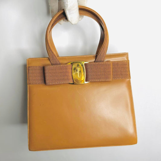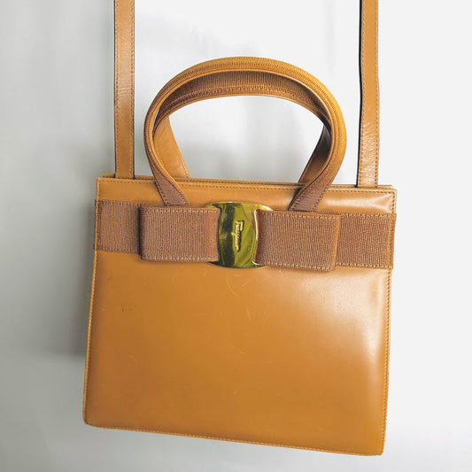 Salvatore Ferragamo Vara Bow Kelly Caramel Brown GHW Monogram Logo Smooth Leather 2-Way Top Handle Shoulder Sling Bag