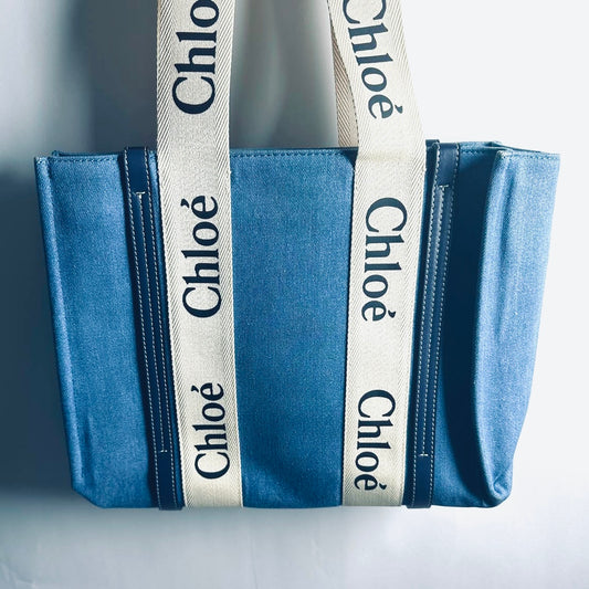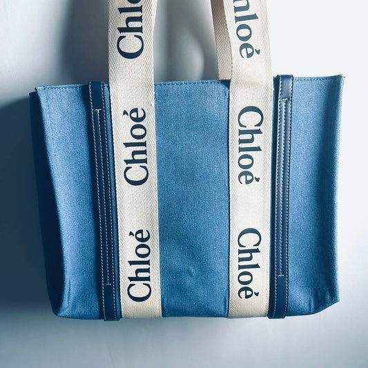 Chloe Woody Denim Blue / White Monogram Logo Shopper Medium Shoulder Tote Bag