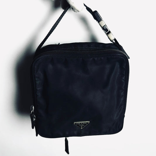 Prada Black Tessuto Monogram Logo Top Handle Hobo Pochette Vanity Case Bag