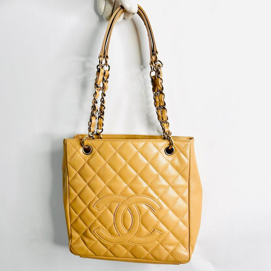 Chanel PST Beige GHW CC Giant Monogram Logo Quilted Caviar Vintage Petite Shopper Shoulder Tote Bag 8s