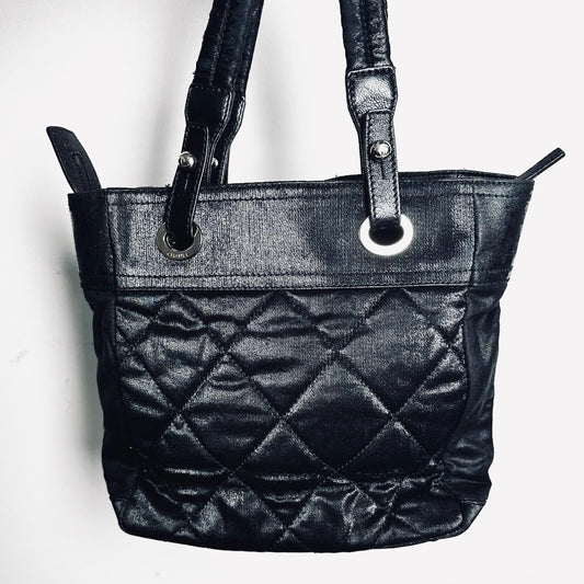 Chanel Black Paris Biarritz PM CC Monogram Logo Quilted Jersey & Leather Shopper Shoulder Tote Bag 11s