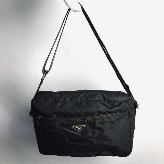 Prada Dark Khaki Green Monogram Logo Tessuto Sport Nylon & Leather Camera Shoulder Sling Bag