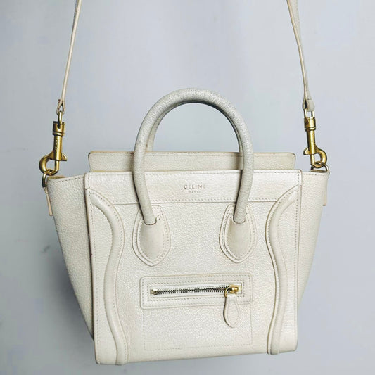 Celine Nano Luggage White GHW Grained Calfskin Monogram Logo 2-Way Top Handle Shoulder Sling Bag
