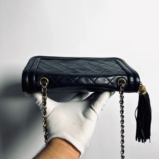 Chanel Black GHW CC Monogram Logo Tassel Fringe Quilted Lambskin Flap Vintage Shoulder Sling Bag 1s