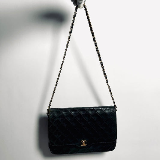 Chanel Black GHW CC Monogram Logo Turnlock Single Flap Quilted Lambskin Vintage Shoulder Sling Bag Pre Series