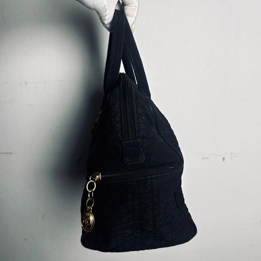 Christian Dior CD Black GHW Lady Dior Cannage Quilted Nylon Top Handle Boston Shopper Tote Bag