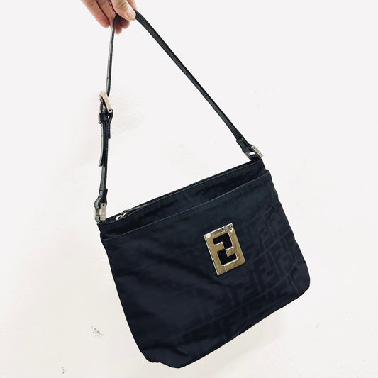 Fendi Black Zucca FF Giant Monogram Logo Hobo Baguette Shoulder Bag