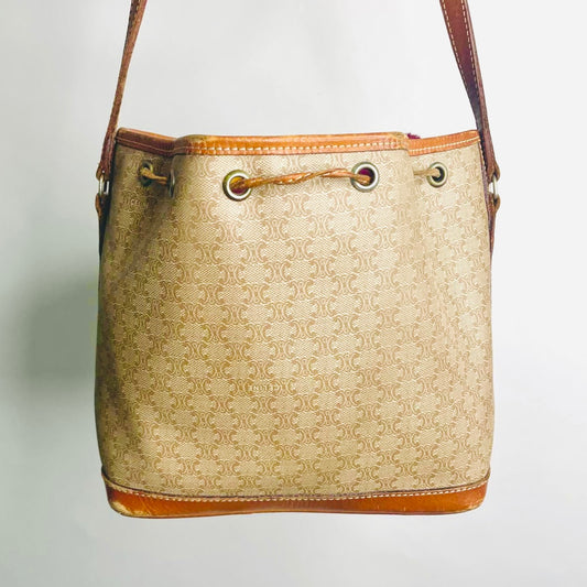 Celine Beige Triomphe Macadam Monogram Logo Vintage Bucket Drawstring Shoulder Sling Bag