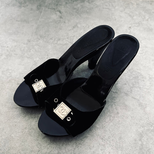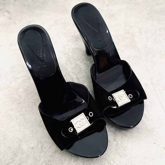 Chanel Classic Giant CC Logo Black Suede & Leather Open Toe Bow Ballet Ballerina Mules Heels Pumps Shoes