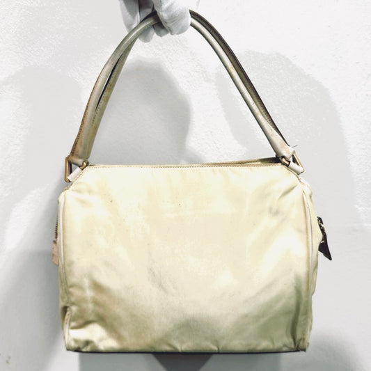 Prada Khaki Beige / White Tessuto Utility Monogram Logo Nylon & Leather Boston Bowling Shopper Shoulder Tote Bag