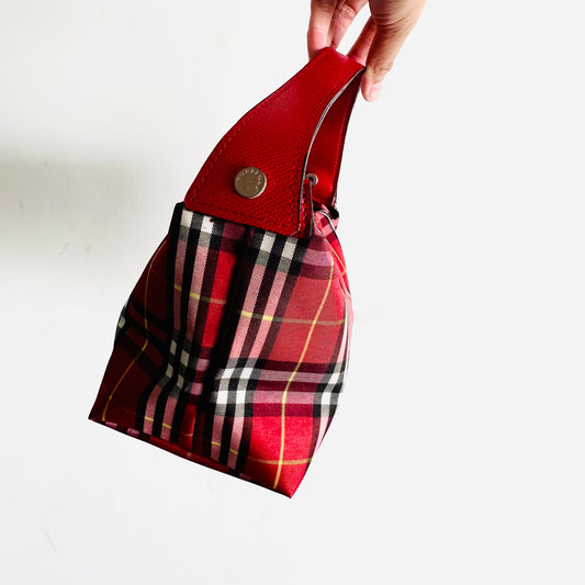 Burberry Deep Red Classic Check Nova Haymarket Checkered Baguette Hobo Shoulder Bag Wrislet Pouch Clutch
