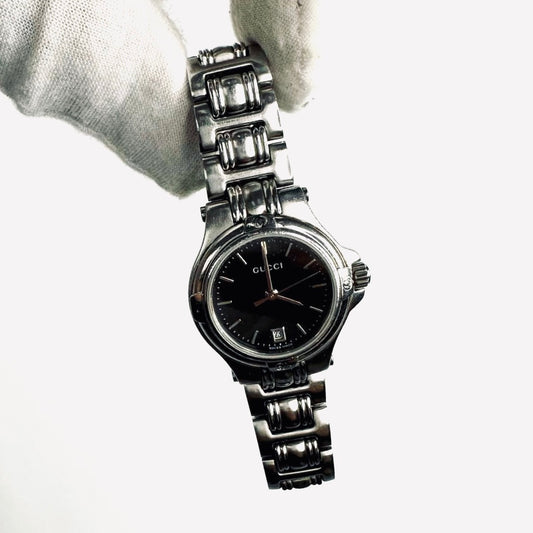 Gucci Black Round Dial Monogram Logo Stainless Steel 26MM 9040L Watch