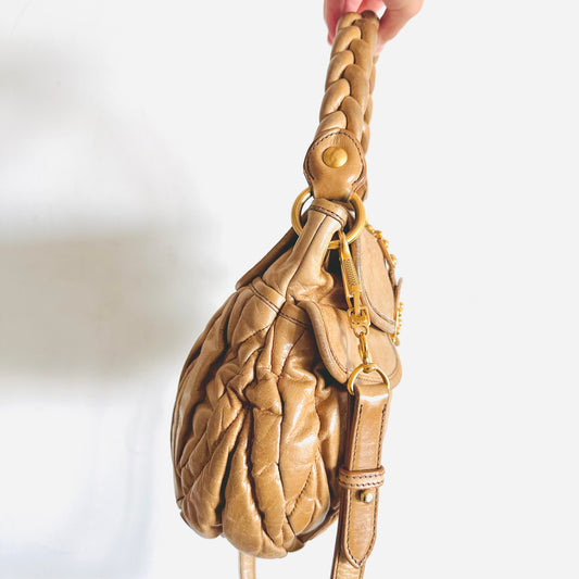 Miu Miu Blush Beige Pink GHW Gaufre Matelasse Lux Leather Classic Logo 2-Way Bauletto Hobo Shopper Shoulder Baguette Sling Bag